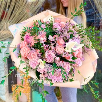 Букет из роз, маттиол и статицы