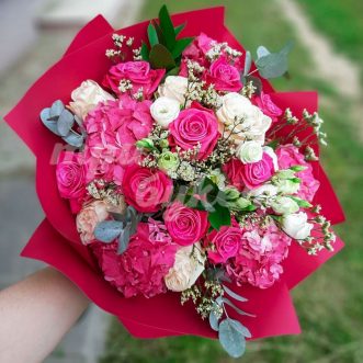 Букет из розовых роз и гортензии