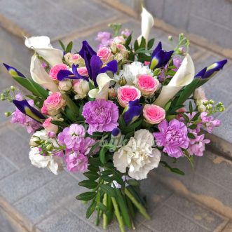 Букет из ирисов, гвоздик и маттиол