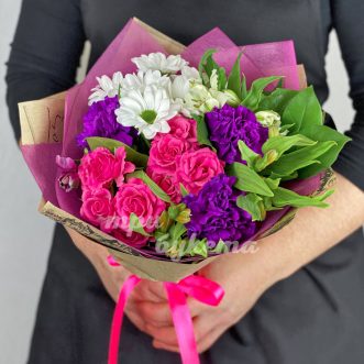 Букет из роз и хризантем в крафте