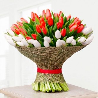 101 красный и белый тюльпан в сетке 20100 ₽