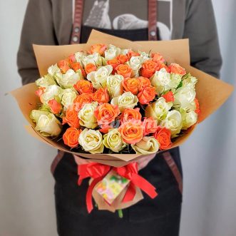 Оранжевые и белые розы в крафте 13100 ₽