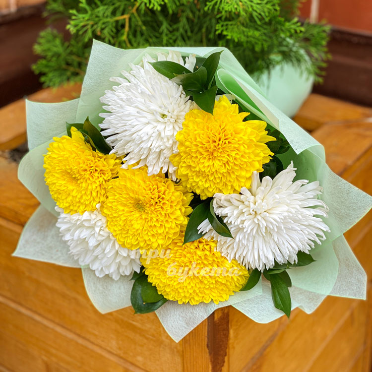 Букет из 15 белых и желтых хризантем