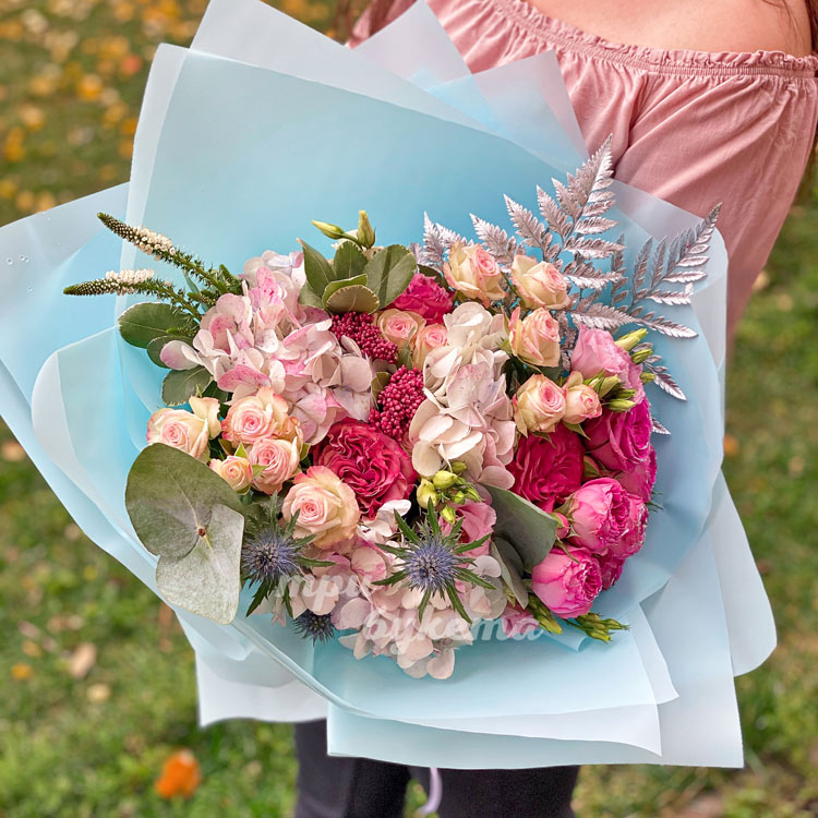 Букет из гортензий и пионовидных роз