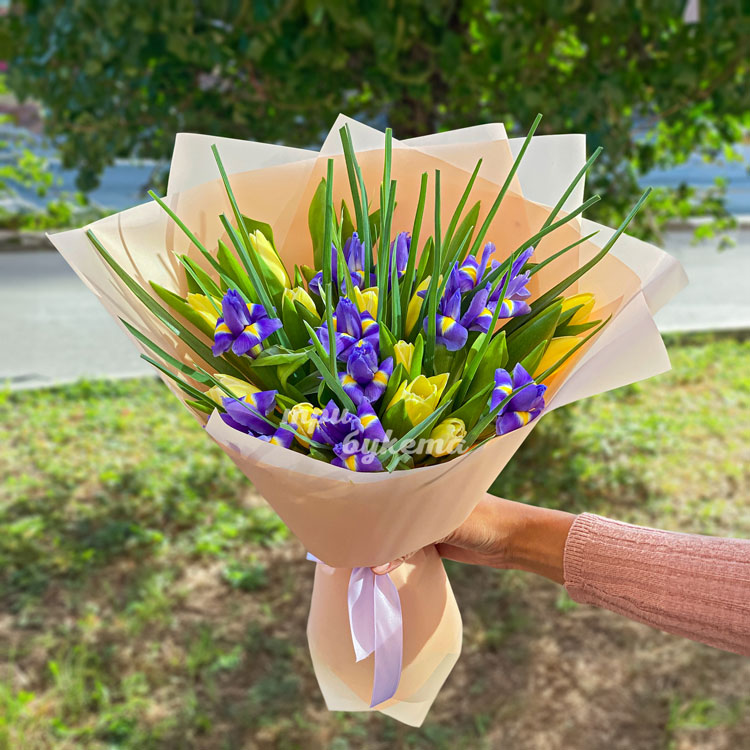Букет из желтых тюльпанов и ирисов