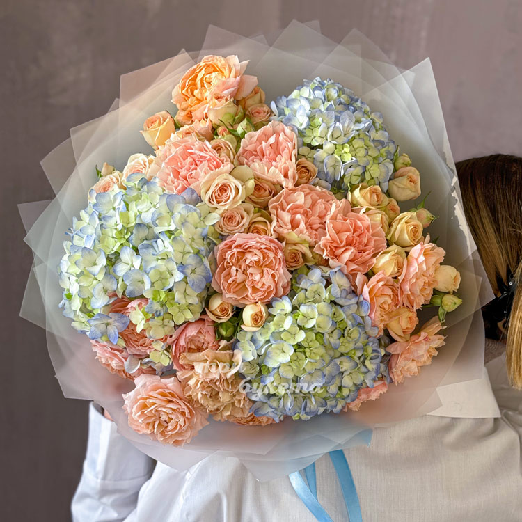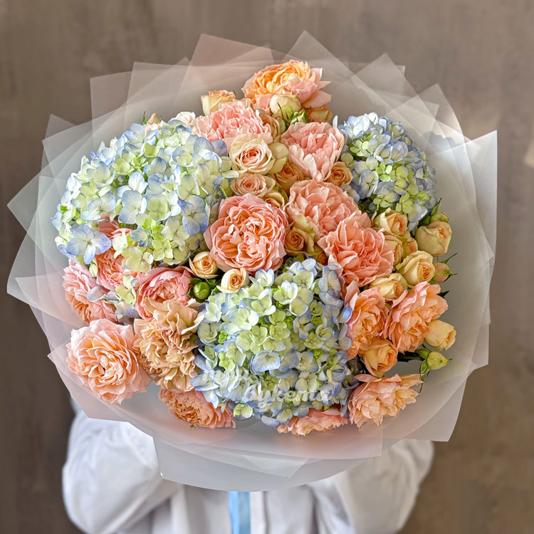 Букет персиковых кустовых роз и гортензий