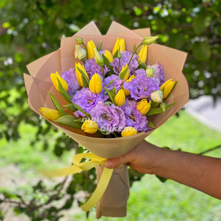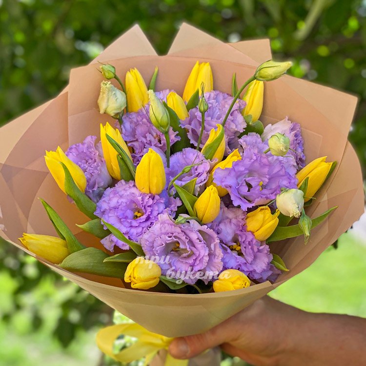 Букет желтых тюльпаном с эустомами