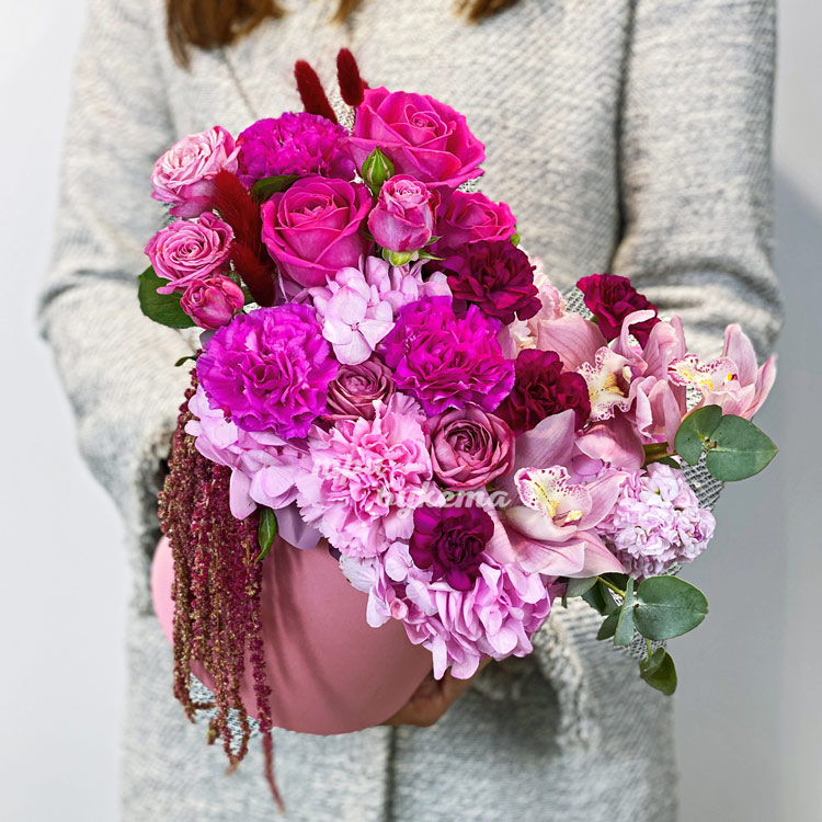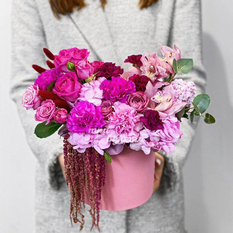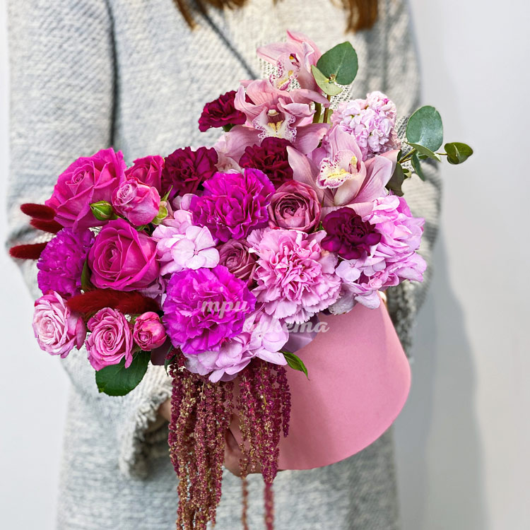 Коробка розовых гвоздик и роз с амарантом