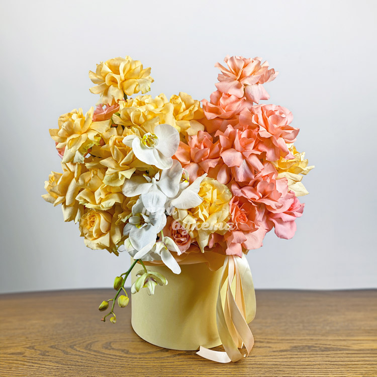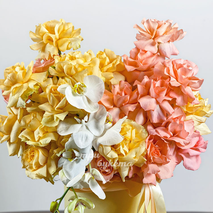 Коробка с желтыми и персиковыми розами