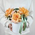 Коробка зеленых гвоздик, роз и вибурнума