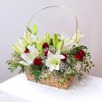 Корзина с белой сиренью и зеленью
