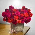Персиковые розы с синими гортензиями в корзине
