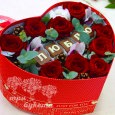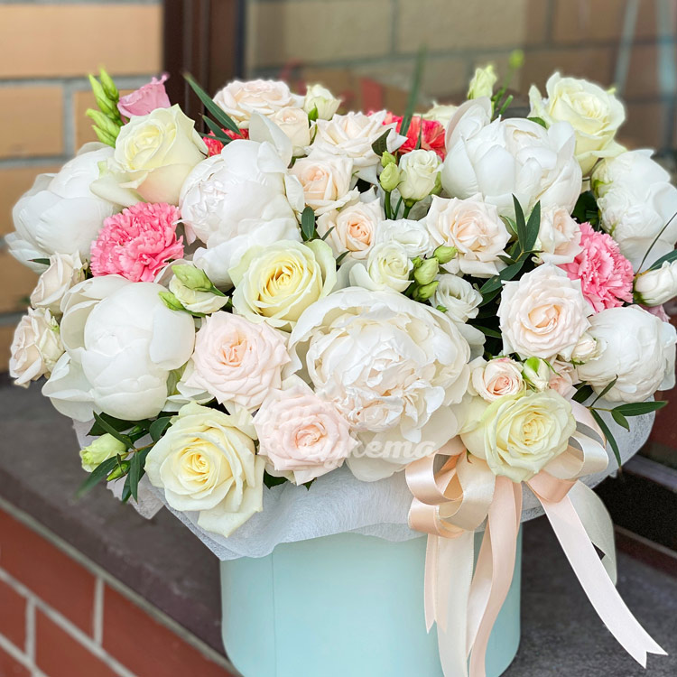 Пионы, розы и эустомы в коробке