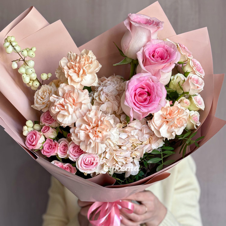 Розовые розы и персиковые диантусы в букете