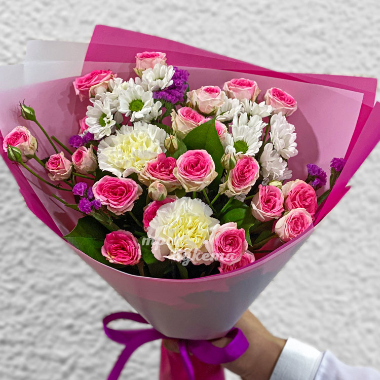 Розовый букет кустовых роз и хризантем