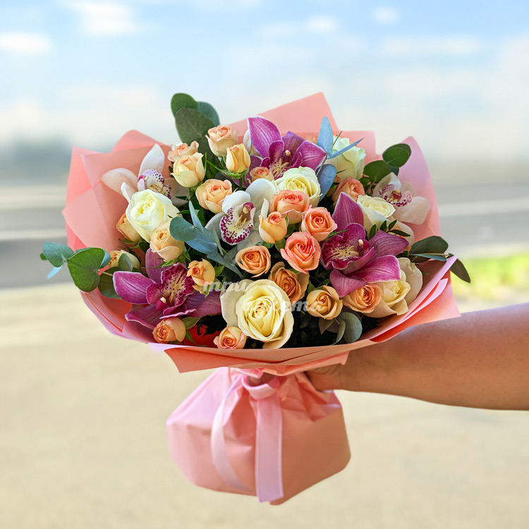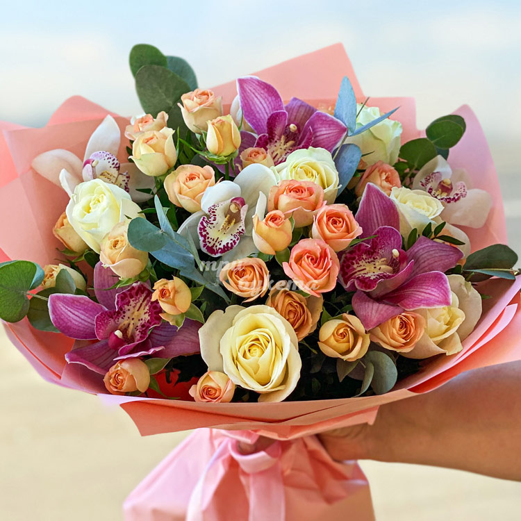 Яркий букет из орхидей и роз на 8 марта