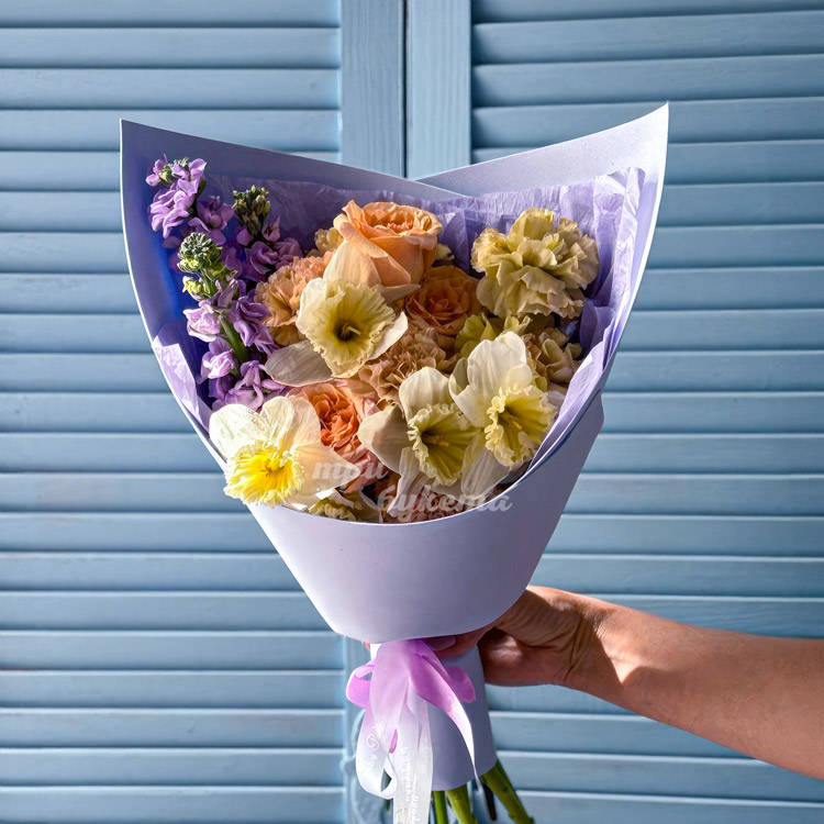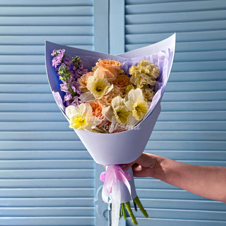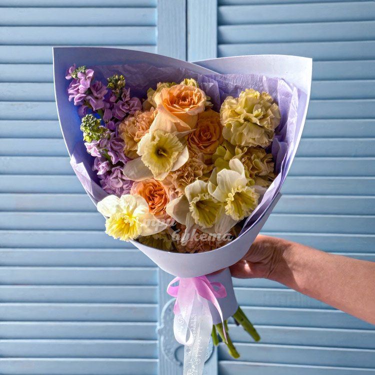 Яркий букет нарциссов и диантусов
