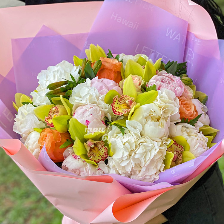 Яркий букет орхидей, гортензий и пионов